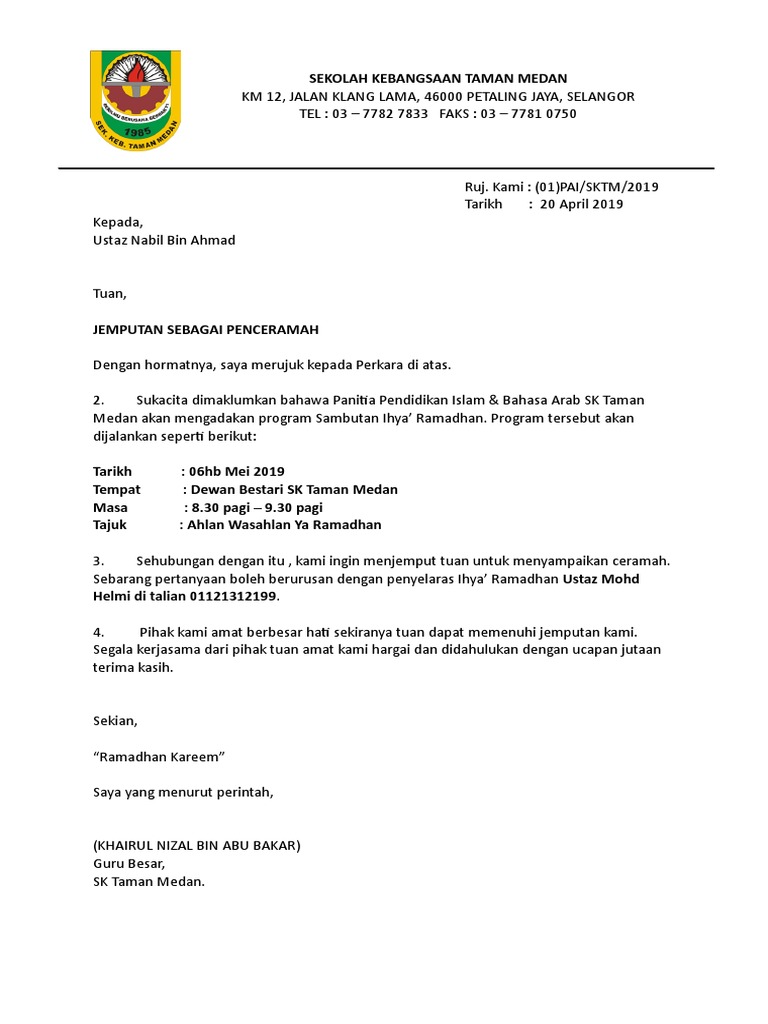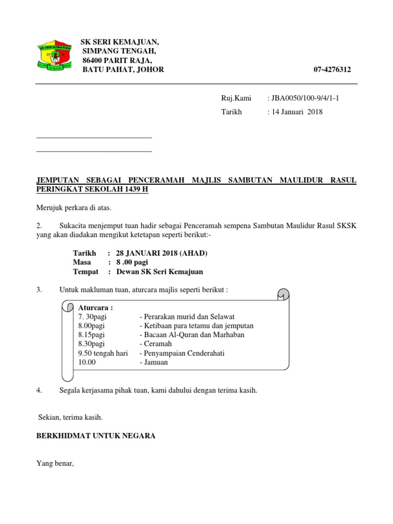 Untuk menjemput orang luar hadir memberikan ceramah di sekolah kita perkara yang paling penting. Surat jemputan program jom ke sekolah skpm Muhammad Mukhlis. Contoh Surat Jemputan Ustaz - Mansuruddin bin mohamad ibrahim 651202 61 5011 57 10 no 37 1 taman koperasi polis phase 2 68100 kuala lumpur.
